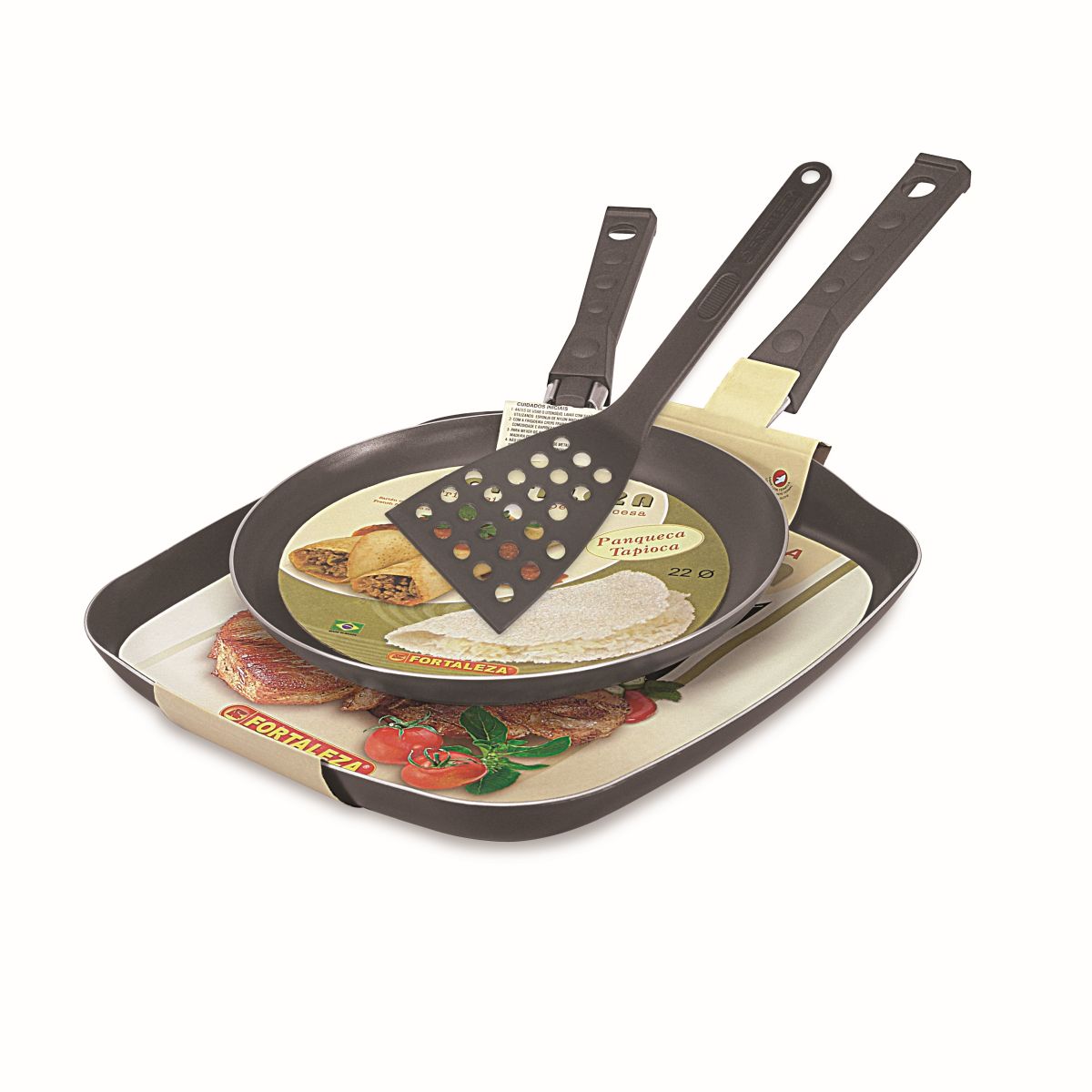 Com este kit você consegue fazer muitas coisas gostosas, na bistequeira você deixa sua carne, frango ou peixe bem grelhado, com sabor delicioso. A panquequeira faz deliciosas panquecas e tapiocas doces e salgadas, de forma simples e rápida. Fica uma delícia. Produto fabricado no melhor padrão de qualidade, com alumínio 100% puro e aplicação de antiaderente de qualidade máxima, os alimentos não grudam em sua superfície, o que ajuda a evitar o uso exagerado de gordura no preparo dos alimentos, tornando-os mais saudáveis. Prático para usar no dia-a-dia, seu cabo anatômico e antitérmico, dá mais comodidade, segurança e facilidade no manuseio das peças.